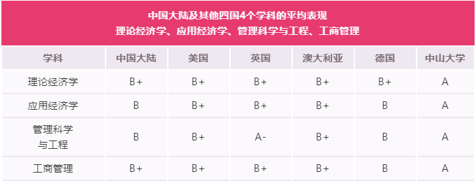 評級結果還表明,中山大學嶺南學院建設的理論經(jīng)濟學、應用經(jīng)濟學、管理科學與工程、工商管理四個學科,不僅優(yōu)于中國大陸高校的平均表現(xiàn),同時也優(yōu)于美國、英國、澳大利亞及德國高校的平均表現(xiàn)。在此次評級的絕大多數(shù)學科中,中國大陸高校的表現(xiàn)均優(yōu)于世界其他地區(qū)的院校??傮w而言,中國高校的平均分數(shù)為B+,全球平均分數(shù)為B,而嶺南學院建設的四大學科均獲評A級,表明學院的學科建設水平已躋身國際先進行列。