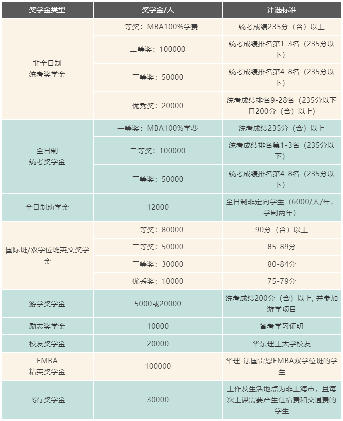 4.國(guó)際班/雙學(xué)位班英文獎(jiǎng)學(xué)金:報(bào)考華理-英國(guó)華威國(guó)際班、華理-美國(guó)羅格斯國(guó)際班、華理-法國(guó)ICN MBA雙學(xué)位班、華理-法國(guó)雷恩EMBA雙學(xué)位班的考生,英文單項(xiàng)分?jǐn)?shù)按照90分及以上、85-89分、80-84分、75-79分進(jìn)行評(píng)定。國(guó)際班/雙學(xué)位班英文獎(jiǎng)學(xué)金與非全日制統(tǒng)考獎(jiǎng)學(xué)金三等獎(jiǎng)、優(yōu)秀獎(jiǎng),全日制統(tǒng)考獎(jiǎng)學(xué)金三等獎(jiǎng)就高進(jìn)行評(píng)定,不可疊加。