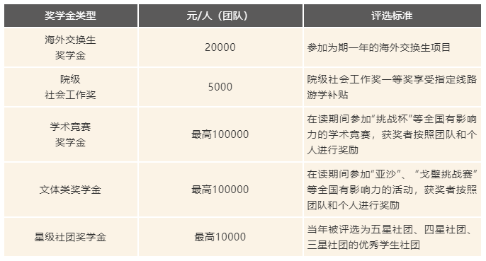 13.星級(jí)學(xué)生社團(tuán)獎(jiǎng)學(xué)金:當(dāng)年被評(píng)選為五星社團(tuán)、四星社團(tuán)、三星社團(tuán)的優(yōu)秀學(xué)生社團(tuán)可獲得該項(xiàng)獎(jiǎng)學(xué)金。