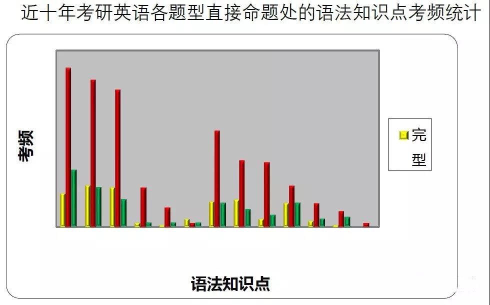 英語語法涉及面廣,涵蓋知識點多且細。但是在考研語法復習中,我們應狠抓重點,突破考點。對重點和考點的界定不能是主觀臆測,而是應有事實根據,就此,王博老師對近十年的考研英語真題各類題型(完型填空、閱讀、翻譯)直接命題處的語法知識點做了精細的統計與分析(見下圖):