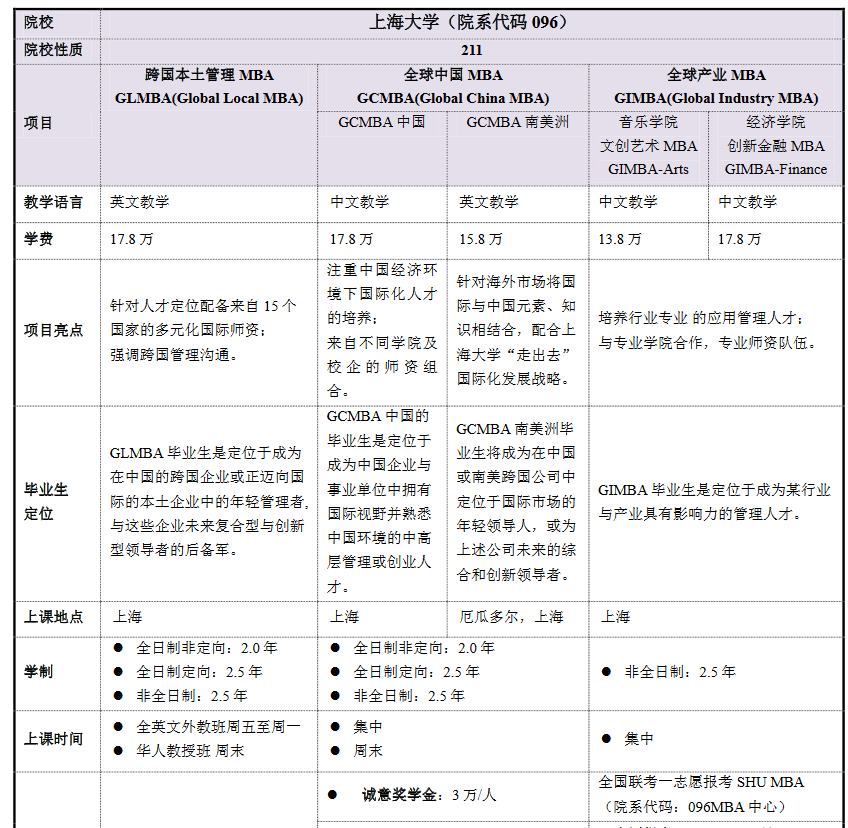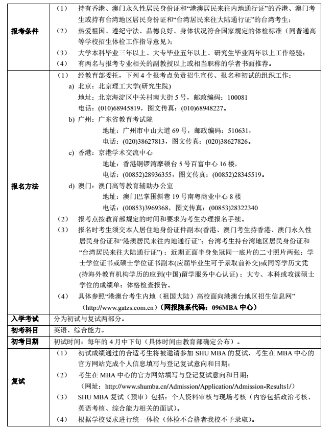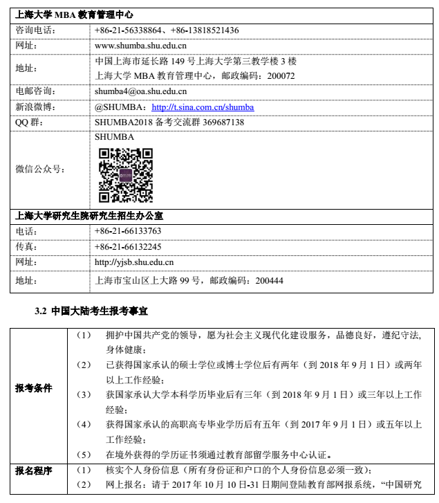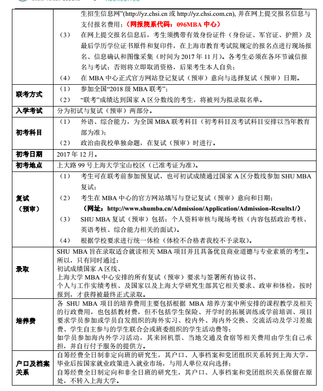 導讀:新一輪MBA備考開始了,各大院校也陸續公布了自己的招生簡章,下面是上海大學MBA項目招生簡章的相關內容,提供給大家參考!