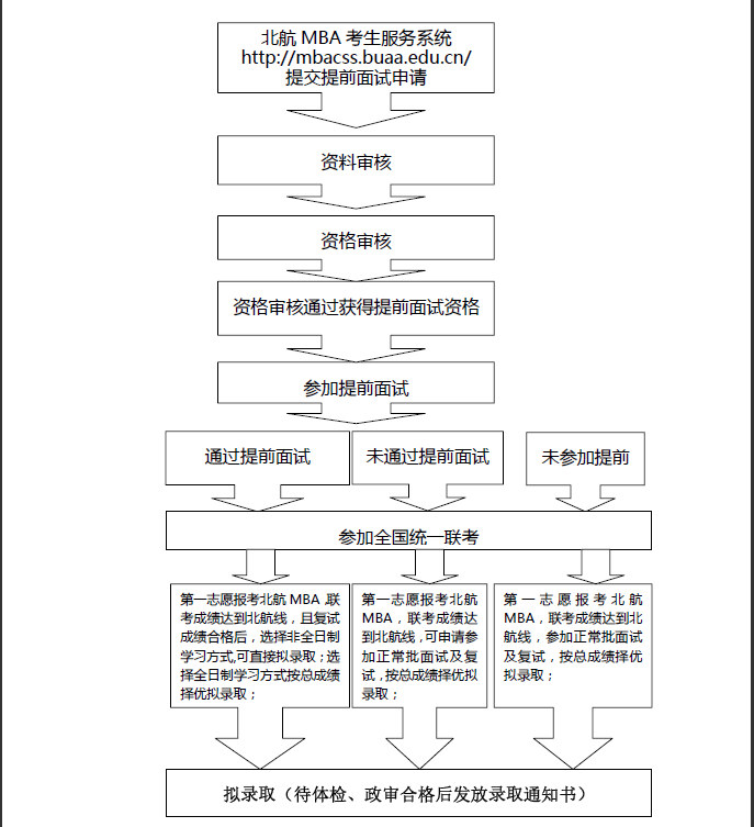 通過考生:第一志愿報考北航MBA,聯考成績達到北航線,復試成績合格,選擇非全日制學習方式可直接擬錄取;選擇全日制學習方式按總成績擇優擬錄取;