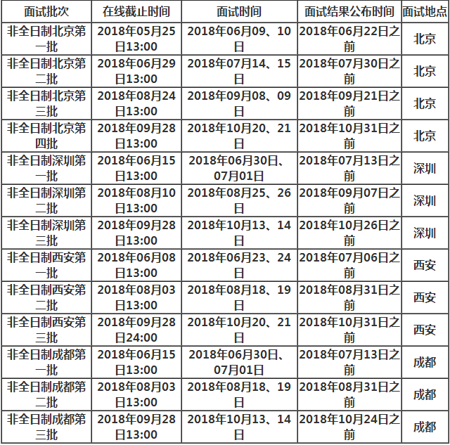2019年非全日制MBA北京項目、深圳項目、西安項目、成都項目共設有13個申請批次,請申請人按規定時間在線提交材料;MBA項目根據申請人的材料進行評審后,定期組織面試。
