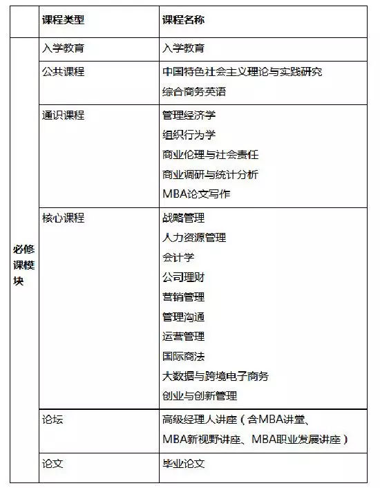 課程分為必修課及選修課兩大類:必修課包括5大模塊(公共課程模塊、通識課程模塊、核心課程模塊、論壇模塊),選修課包括“財務管理模塊、人力資源管理模塊、營銷管理模塊、運營管理模塊、“一帶一路”模塊、實驗實踐教學模塊”