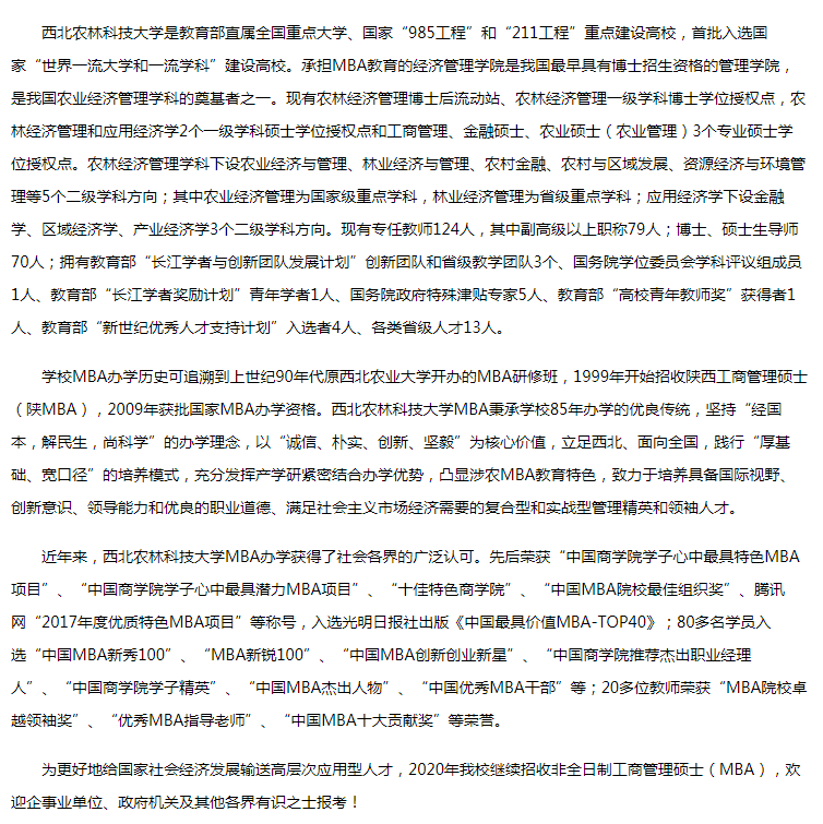 以上就是“2020年西北農(nóng)林科技大學非全日制MBA(工商管理)招生簡章”的全部內(nèi)容!祝您考研成功!