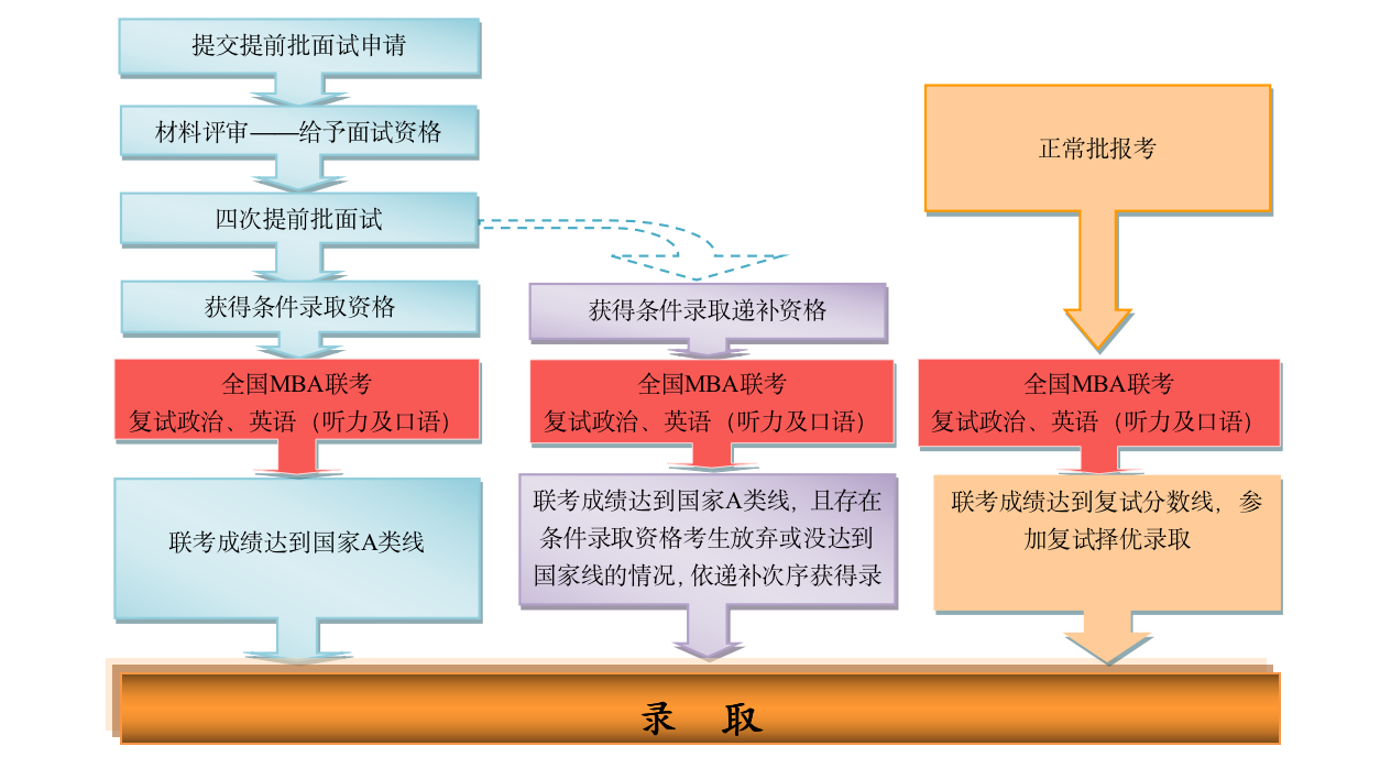 登錄中國人民大學商學院MBA項目中心網站“考生服務系統”,按照規定時間提交網上申請材料,學院將組織專家評審申請材料,擇優給予提前面試資格并組織面試。面試后獲得條件錄取資格和條件錄取遞補資格的考生需參加2020年12月底舉行的全國聯考。