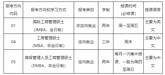 管理學院2021年計劃面向全國招收工商管理碩士學位研究生(招生計劃人數待定,請留意后續更新),包括工商管理碩士(MBA,非全日制)、國際工商管理碩士(IMBA,全日制)、高級管理人員工商管理碩士(EMBA,非全日制)三個報考方向。