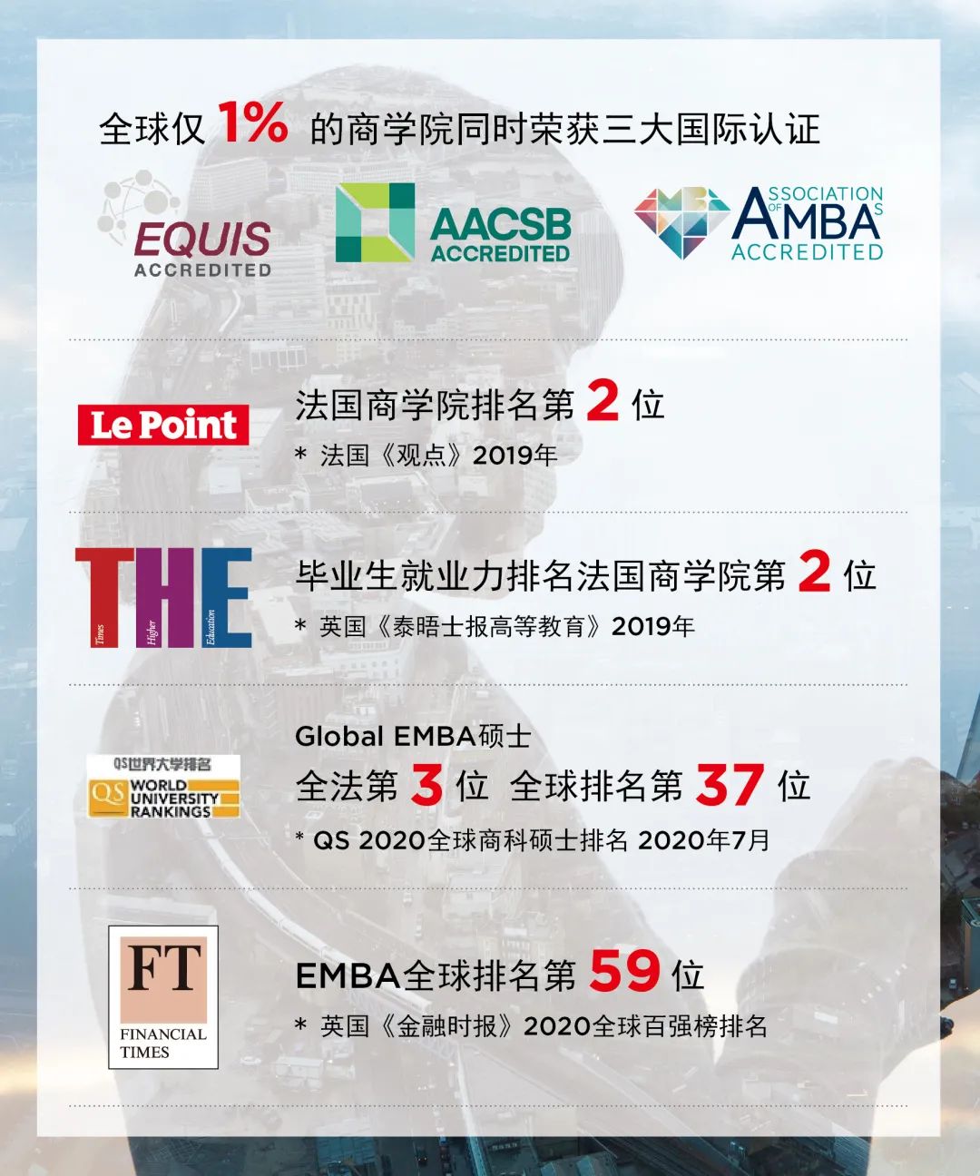 里昂商學院EMBA全球排名領先,2020年度在FT金融時報排名全球第59,QS全球排名第37