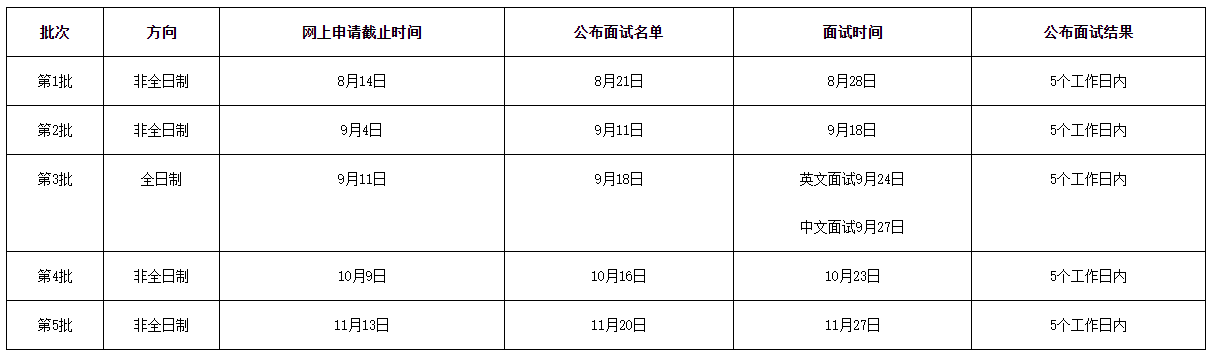 2022年MBA將舉行5個批次提前面試,面試時間為8-11月。學院保留根據申請的實際情況和面試的進展情況臨時減少或增加面試批次的權利,以下時間有可能會隨招生進度有所調整,最終以我院面試前公布的通知為準。