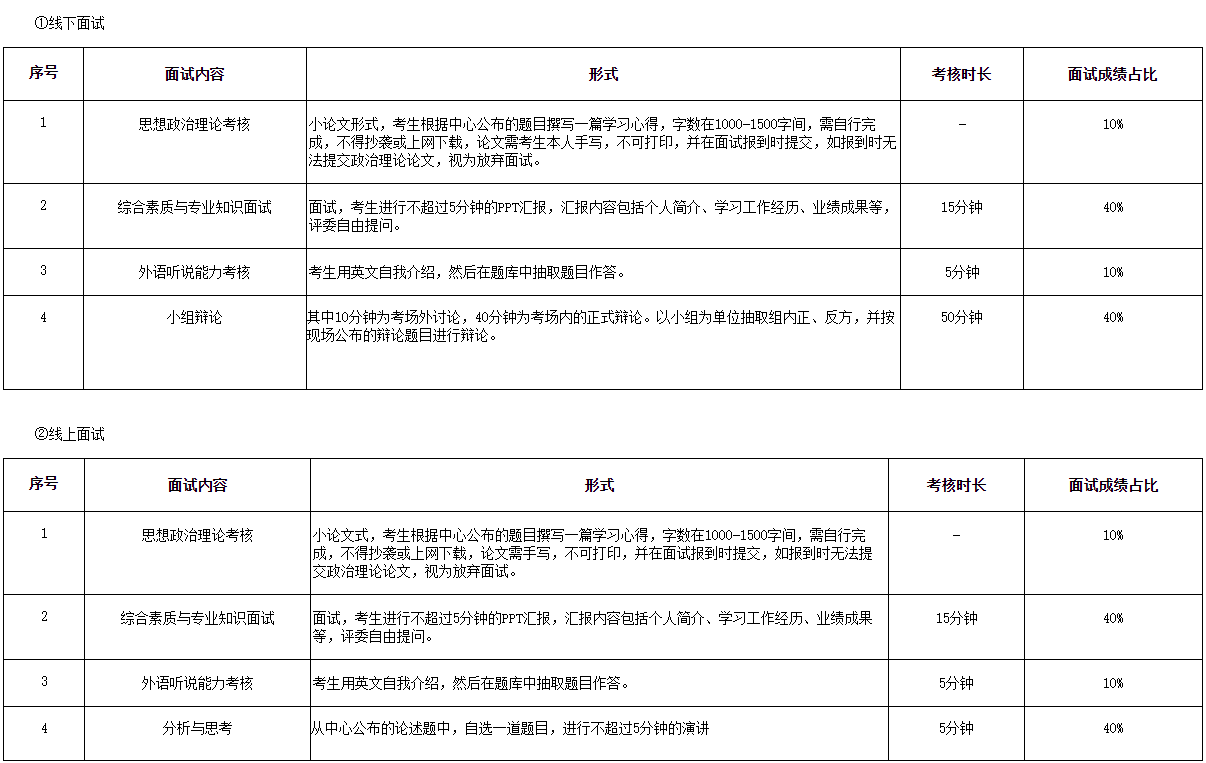 線上和線下面試內容、形式和面試成績占比具體如下: