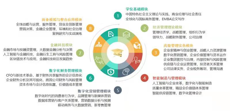 EMBA課程分為學位基礎模塊、經濟管理理論模塊、高級管理實務模塊、專業方向選修模塊、商業模擬與整合應用模塊。