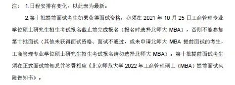 因2022年全國碩士研究生招生考試網上報名時間較往年有提前,北師大2022年MBA的提前面試批次及時間安排做出調整,最新見下圖及說明。