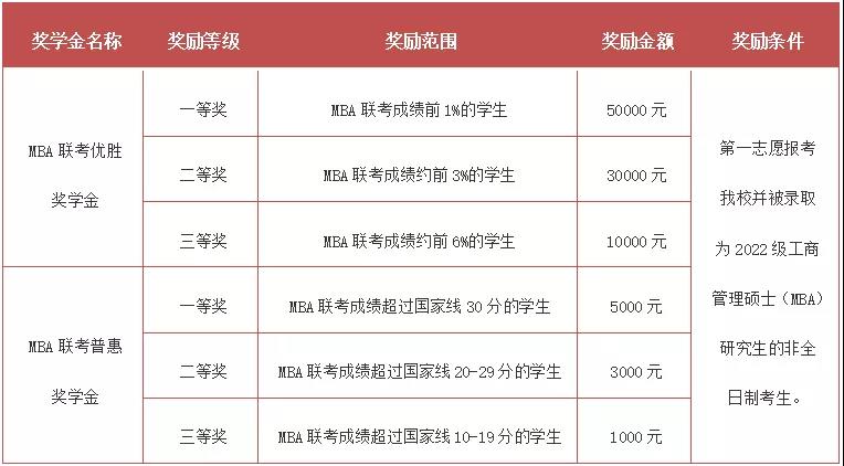 MBA聯考普惠獎學金。其獎勵范圍、獎金額度和獎勵對象如表二所示。2022級非全日制MBA新生獎學金評選辦法詳見后續通知。若有變動,均以具體通知為準。