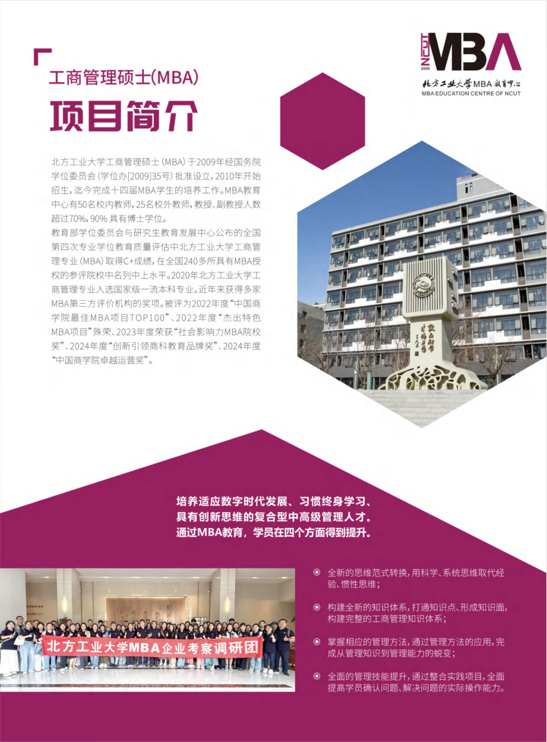 導(dǎo)讀:項目簡介北方工業(yè)大學工商管理碩士(MBA)于2009年經(jīng)國務(wù)院學位委員會(學位辦[2009]35號)批準設(shè)立,2010年開始招生,迄今完成十四屆MBA學生的