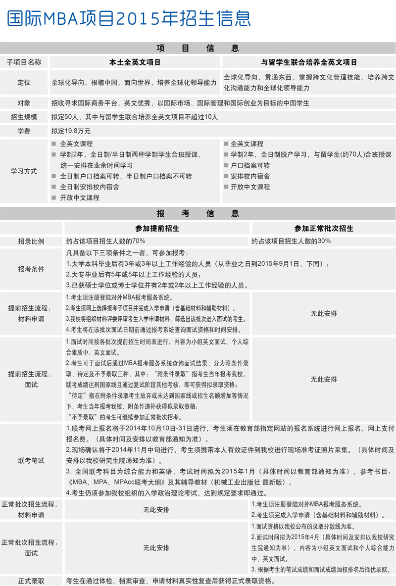 對外經濟貿易大學2015年MBA項目招生工作現已啟動,國際MBA項目招生信息如下: