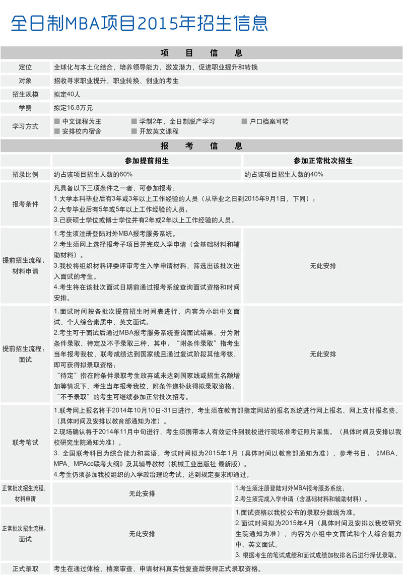 2. 招生形式分為提前招生和正常批次招生兩種類型,提前招生適用于:①申請國際項目的考生,名額約占國際MBA招生人數的70%;②申請全日制項目的考生,名額約占全日制MBA招生人數的60%;③申請在職項目的考生,名額約占在職MBA招生人數的60%。