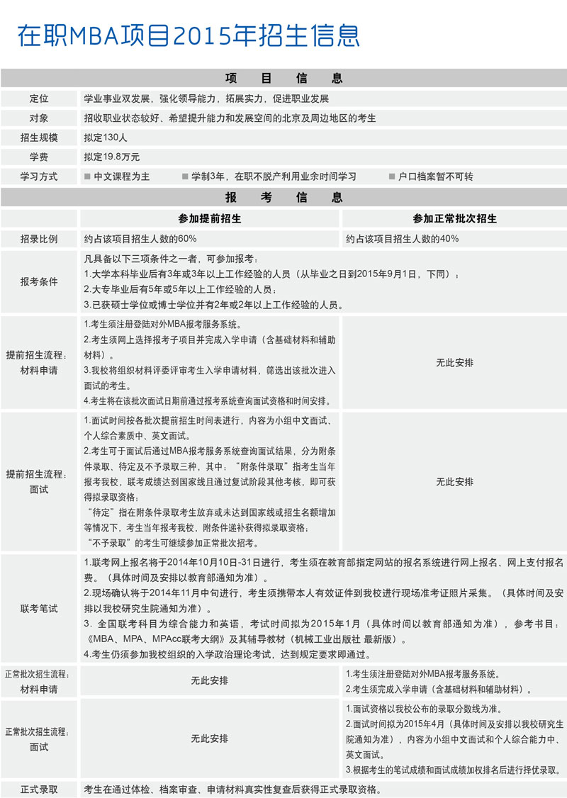 對外經濟貿易大學2015年MBA項目招生工作現已啟動,在職MBA項目招生信息如下: